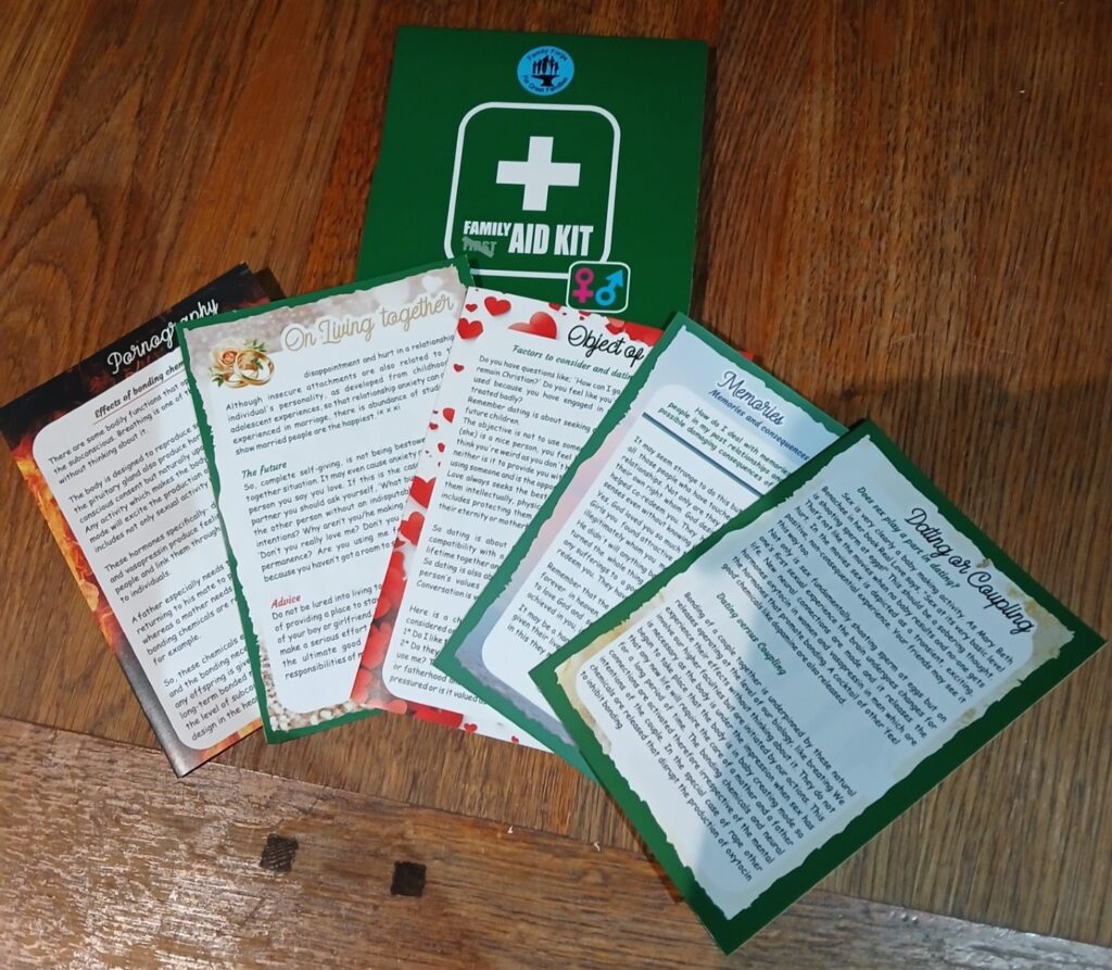 The Aid encourages the setting up of personal boundaries in a world where anything goes and includes the effects on the human brain of certain behaviors because of this, the aids can also be used by parents as a corrective where the behaviour embarked on is not leading to healthy lifestyles. Either the appropriate aid could be given directly to your child or used as an aid to open the conversation again. Parents have the responsibility to assist God in winning their children back to the faith. Since God is spirit this comes through knowledge, reason and love shown in care.